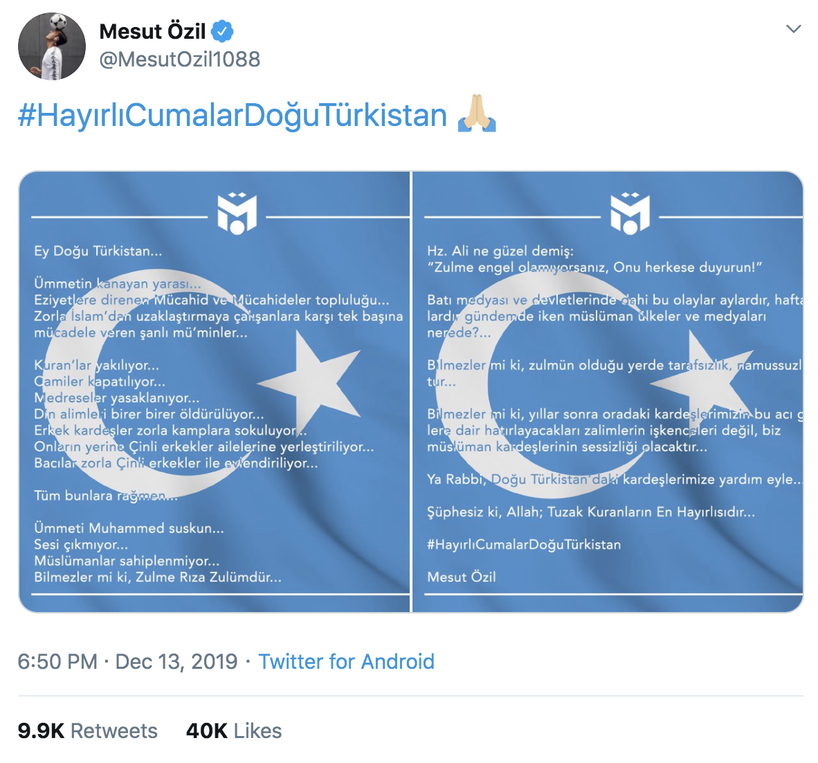 مەسئۇد ئۆزىل ئەردى يەشىل مەيداندا بىر چولپان، بۈگۈن بولدى مىليونلۇق زور قوشۇنغا قوماندان. بۇزۇپ ئىسلام دۇنياسىداكى ناكەس سۇكۇتنى، ئىلاجسىز قالغان ئۇيغۇر-تۈرككە بەردى كۈچ دەرمان.